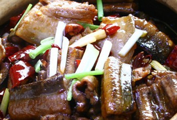 砂鍋鱔魚的做法:先將冬菇浸軟去腳、燒腩切塊,蒜肉用將滾之油炸黃撈起,把鱔魚洗凈抹水?dāng)貕K,加 腌料腌二十分鐘。然后將鱔魚沾滿生粉用滾油大火炸黃撈起,約二分鐘后重炸至金黃色撈起。再將生菜洗凈,切短段放在煲仔內(nèi) 。[美食中國(guó)]在鍋內(nèi)放油一湯匙,爆香姜、蒜,放冬菇和酒半湯匙,加入調(diào)味煮滾,把燒肉和鱔魚兜均勻,倒落在己放有生菜之 煲內(nèi),最后加蓋大火煮滾,放蔥和加油二湯匙即可。